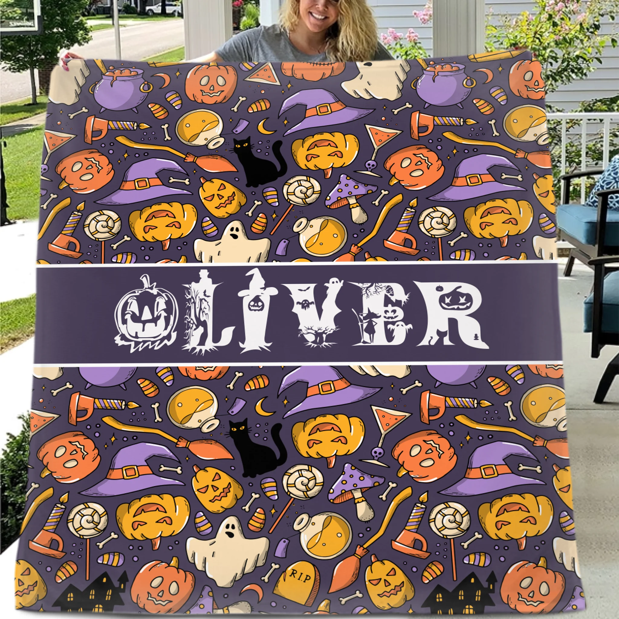 Custom Halloween Name Blanket – Personalized Pumpkin & Ghost Letter – Gift for Kids